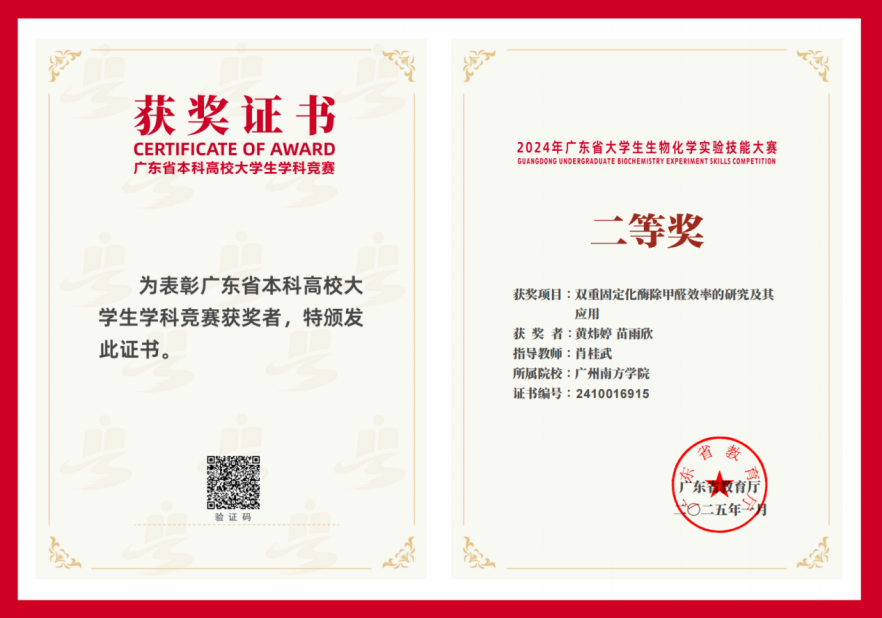 2024年11月,我院肖桂武老师在2024年广东省大学生生物化学实验技能大赛带领团队荣获二等奖。