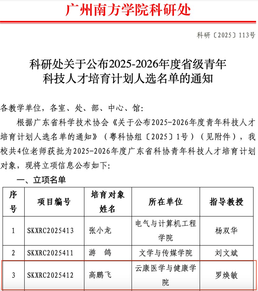 高鹏飞老师的项目《2025-2026年度广东省科协青年科技人才培育计划》申报立项了2025-2026年度青年科技人才培育项目。